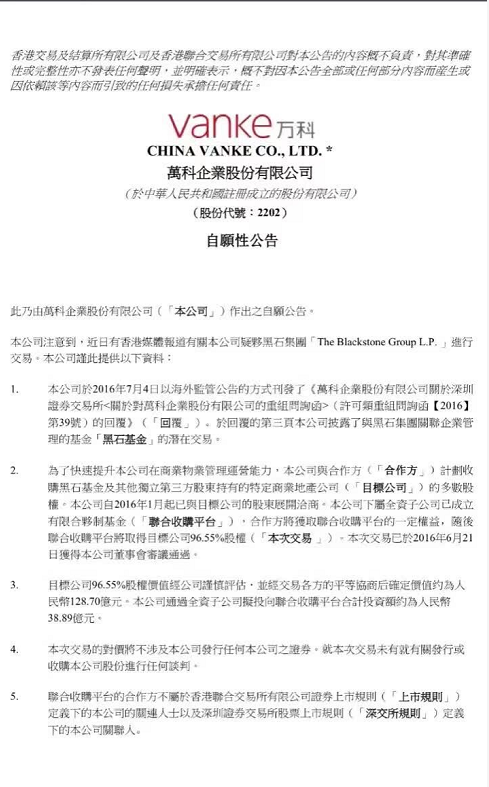 1.本公司于2016年7月4日以海外监管公告的方式刊发了《万科企业股份有限公司关于深圳证券交易所<关于对万科企业股份有限公司的重组问询函>(许可类重组问询函【2016】第39号)的回复》(「回复」)。于回复的第三页本公司披露了与黑石集团关联企业管理的基金「黑石基金」的潜在交易。