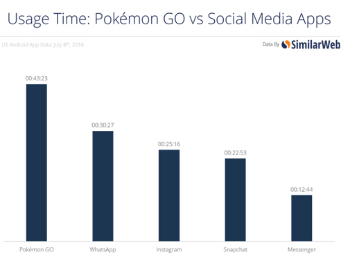 除了每日活躍用戶數越來越多以外,用戶在這款游戲中耗費的時間也已經遠遠超過其他知名社交媒體。在7月8號當天,用戶使用《口袋妖怪Go》的平均時間為43分鐘零23秒,已經遠遠超過了其他美國知名的社交媒體WhatsApp,Instagram, Snapchat以及Messenger。