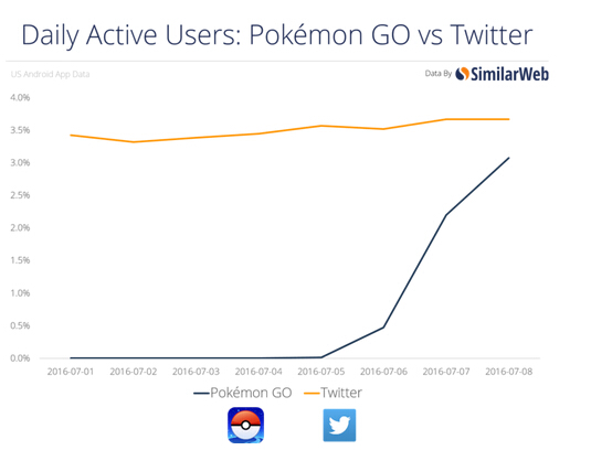 不僅在裝機率上《口袋妖怪Go》遙遙領先,在用戶活躍度上也是來勢洶洶。據統計,美國Android用戶在下載了這一游戲之后,其中有60%的人每日都會打開使用,這種量級讓《口袋妖怪Go》可以和Twitter的日活躍用戶數相比肩。而達到這樣的日活程度《口袋妖怪Go》只用了幾天時間,Twitter則花費了近十年。相信在未來一段時間內,《口袋妖怪Go》的日活躍用戶數超越Twitter應該也不是什么難事。
