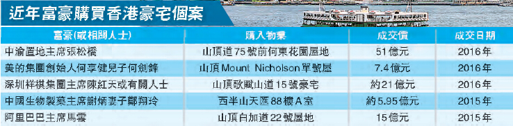 事實上,內地富豪來港買山頂豪宅時有發生。今年市場更屢現天價成交,當中深圳祥祺集團董事局主席陳紅天或有關人士早前便落實以21億元購入山頂歌賦山道15號洋房項目,呎價約22.8萬元,料創全球洋房新高。