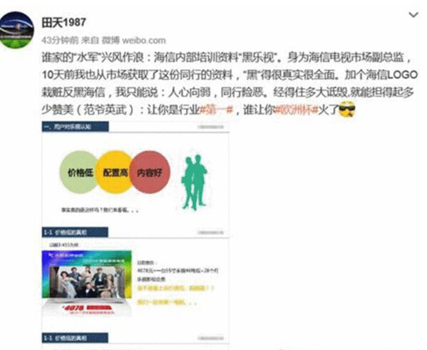 今天(13日)上午:一直緘默的海信電視市場負責人田天(微博名:田天1987)通過微博回應: “誰家的“水軍”興風作浪:海信內部培訓資料“黑樂視”。身為海信電視市場副總監,20天前我也從市場獲取了這份同行的資料,“黑“得很真實很全面。加個海信LOGO栽贓反黑海信,我只能說:人心向弱,同行險惡。經得住多大詆毀,就能擔得起多少贊美(范爺英武):讓你是行業#第一#,誰讓你#歐洲杯#火了(笑臉)”顯然,她否認這是海信所為。她反問記者:黏貼上一個海信LOGO就證明是海信的?這顯然是有人在栽贓陷害海信。歐洲杯后,海信被“黑”不斷,自古槍打出頭鳥。