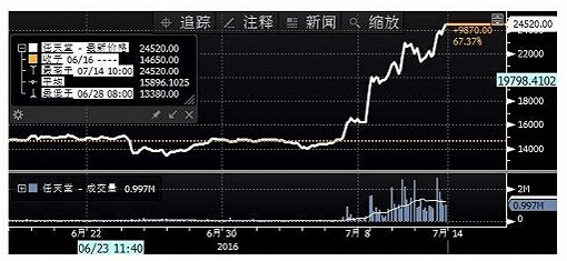 今日任天堂繼續大漲16.6%,股價創2015年8月31日來最高,加上上周逾50%的漲幅,自Pokémon Go發布以來,任天堂的股價飆升約75%,市值暴增近120億美元。