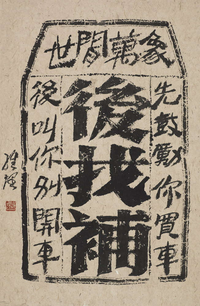“世間萬象”中的作品借用中國傳統商號契據、門票的印版形式,內容置換成當下社會中發生的事件,或鞭撻、或諷刺、或調侃、或點贊,真實胸臆。作品《後找補》、《面子活》、《京》等都能命中當下熱點社會問題的要害,看似玩世的意味中自有真意。