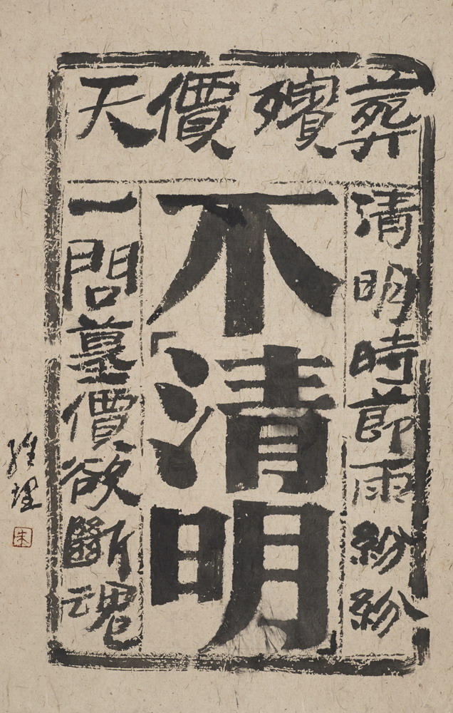 “微言睿語”,一事一議,有感而發,偶然欲書,用毛筆書寫短小而富有深度的“字象”評論,有對欽佩人物的贊許,有對時下各種怪象的批評。作品《不清明》,就用“清明時節雨紛紛,一問墓價欲斷魂”來諷刺時下亂象紛呈的天價喪葬現象。《貴兼濟》、《馮驥才》則以對聯形式表達他對一些當下人物的贊賞。