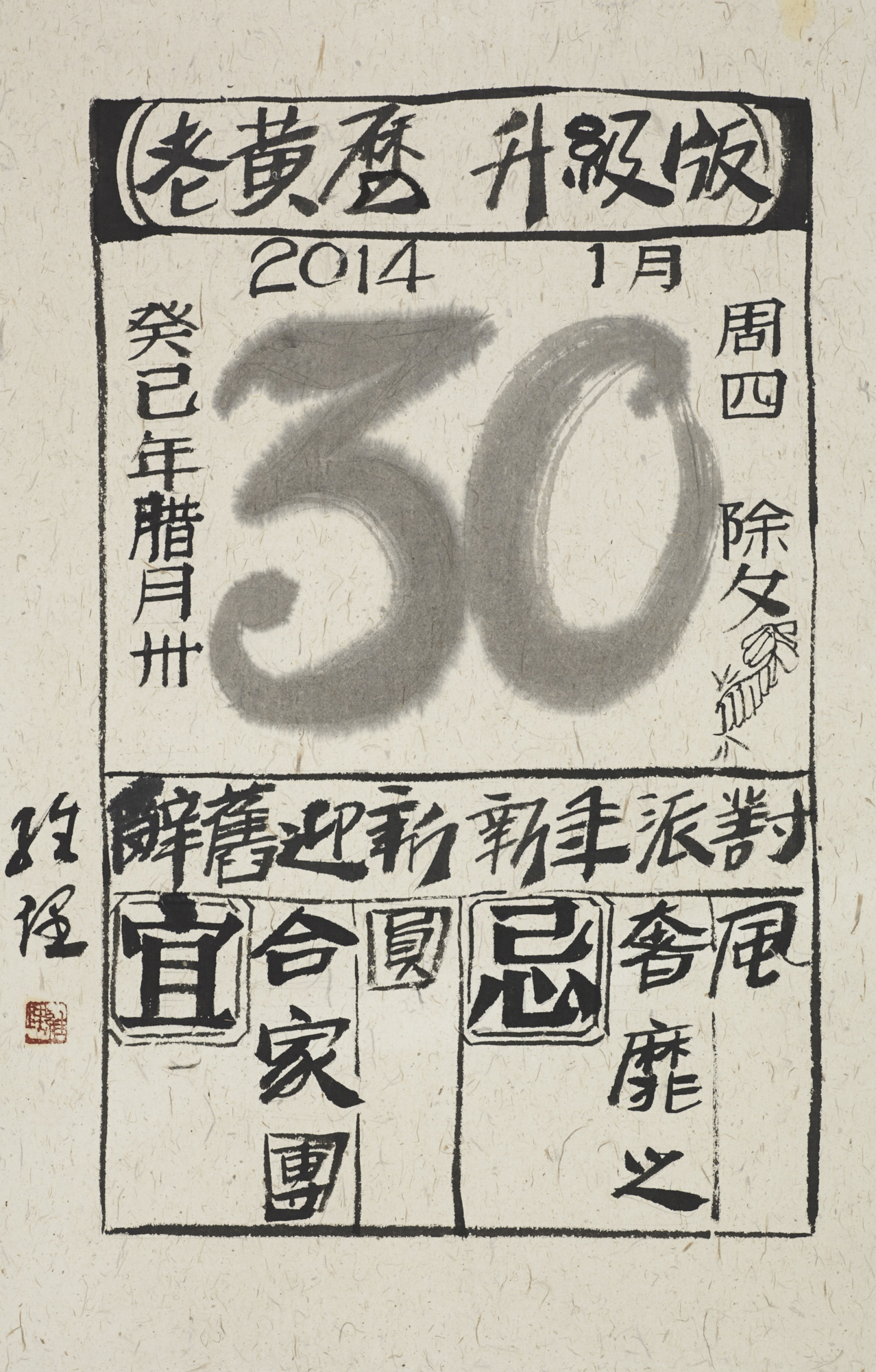 “黃曆升級”,利用老黃曆的內容構成,在作品中采取“宜”、“忌”的勸誡方式,有對眾多傳統節日在新語境下的調侃,有對近年才進入公眾視野的各種公益日的草根語言解讀,還有對新出現的頑疾——霧霾的提醒等等。