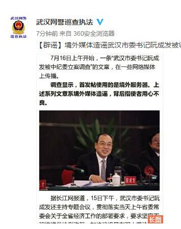 昨天上午開始,一條“武漢市委書記阮成發被中紀委立案調查”的文章,在一些網絡媒體上傳播。