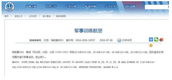 HN0053 SOUTH CHINA SEA MILITARY EXERCISES 2300UTC TO 0900UTC DAILY FROM 18 JUL TO 21 JUL IN AREA BOUNDED BY 1)19-20N/110-33E,2)18-40N/110-25E,3)18-40N/111-04E,4) 19-20N/111-04E。 ENTERING PROHIBITED。 HAINAN M.S.A。