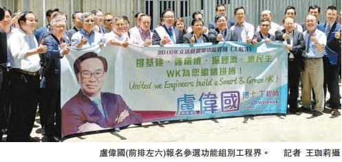 盧偉國則以「WK為您,繼續拼搏﹗」為參選口號,競逐連任工程界立法會議員。他說,現時不清楚對手有誰,強調無論是誰都希望能有公平競爭,及爭取業界支持。他稱,有信心成功當選,又指自己靠過去4年於立法會的工作贏取支持,不會理會政治炒作,強調自己不吹水、亦不抽水,相信務實的工程師會投票予自己。他又說,已簽署確認書,並指《基本法》是香港重要基礎,應該尊重。