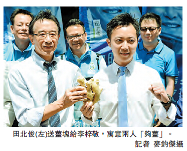 李梓敬則表示,自己從政12年,在這些年來自由黨亦經歷高低起跌,香港亦面對議會的分化、社會兩極化,故自由黨會做有力的橋樑。田北俊亦將薑塊送贈給李梓敬,寓意他們兩人「夠薑」。