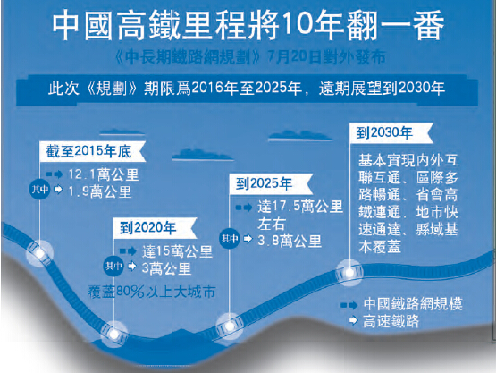 【香港商報网訊】國家發改委、交通運輸部以及鐵路總公司日前聯合印發了《中長期鐵路網規劃》,將中國高鐵網正式由「四縱四橫」升級為「八縱八橫」。同時,根據規劃,「十三五」期間,全國新建鐵路將不低於2.3萬公里,總投資不低於2.8萬億元人民幣。國家發改委基礎產業司司長費志榮在昨日的新聞發布會上指出,目前鐵路投資保持在8000億以上,積極鼓勵社會資本投資建設鐵路,國家現有的鐵路都向社會資本開放。他還指出,這次規劃鐵路與經濟社會發展的融合更加深入。以高速鐵路的站場為支點,來促進沿線經濟社會的協調發展。