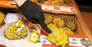 【香港商報網訊】記者馮仁樂報道:海關本周日在機場貨運站截獲一批由南美哥倫比亞經英國倫敦空運抵港,被挖空注入液態可卡因的麒麟果,合共起出13.3公斤液態可卡因,市值1380萬元。前日再將一名提貨的男子拘捕,海關形容利用生果暗藏毒品走私手法罕見,正追捕其餘同黨,不排除稍后會再有涉案人士被捕。