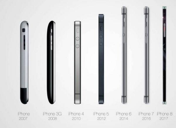 背面回歸玻璃,標配雙攝像頭(這裏展示的是4.7寸款),而且一點也不凸出。Home鍵消失了,直接集成在屏幕內部——技術上可行,而且蘋果一直在探索這一點。再對比一下曆代iPhone,是不是更有眼前一亮的感覺呢?