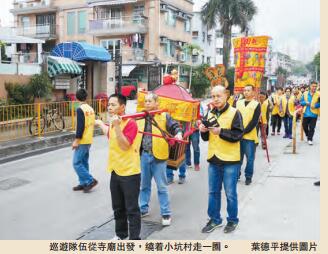 祭祀過后,最特別的活動游神,終於要開始了。葉氏族人穿上黃色的外套,把祖伯公安放到神輿之內,然后由四個人,兩前兩后的抬着;而其他人則打着鑼鼓、擔着旗幡,浩浩蕩蕩地從寺門出發。在道士的引領下,神輿會圍繞小坑村走一圈,并會特意到村公所走一走,期望能為族人帶來平安,同時也庇佑村民。走了一圈以后,游神隊伍就會返回寺廟,在神壇之前繼續活動。