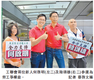 何啟明和陸頌雄同時為香港製造業總工會總幹事及香港鐵路職員工會總幹事。鄭耀棠昨午聯同香港製造業總工會及香港鐵路工會聯合會代表,一齊到場為兩位參選人打氣。兩人擁有多年服務社區及工會工作經驗,早前經過工聯會內部遴選,獲推薦參選今屆立法會功能界別(勞工界),立志將更多的勞工聲音帶入議會,在立法層面進一步推動勞工法例的完善。他們強調,會憑一份執與堅持,決心「為權益,爭工道」。