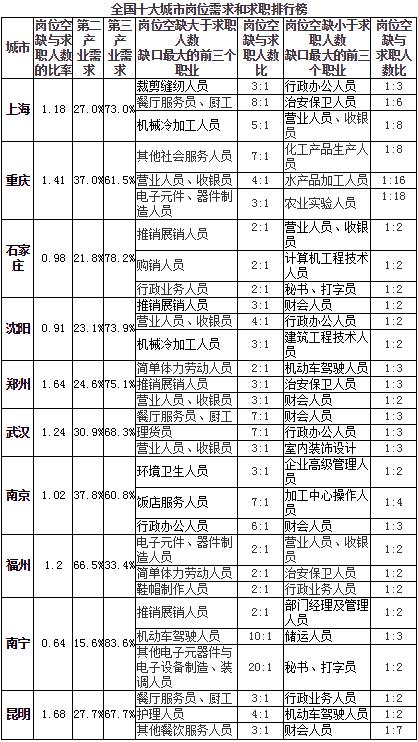同時發布的“全國十大城市崗位需求和求職排行榜”顯示,監控的10個城市里,有9個城市第三產業的用人需求最大,其中有城市急需機動車駕駛人員,崗位需求與求職人數比達到10:1。