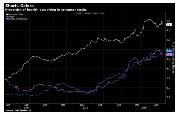 中資消費股成香港股市空頭的獵物。IHS Markit公布的數據顯示,自5月以來,方便面廠商康師傅控股和休閑食品生產商旺旺集團的空頭倉位達到歷史最高。這兩家公司,以及衛生棉制造商恒安國際,在香港基準指數成分股中空頭倉位最重的四家中,位列三席。本月恒安國際將食品業務分拆上市,目前后者股價較首個收市價下跌了27%。
