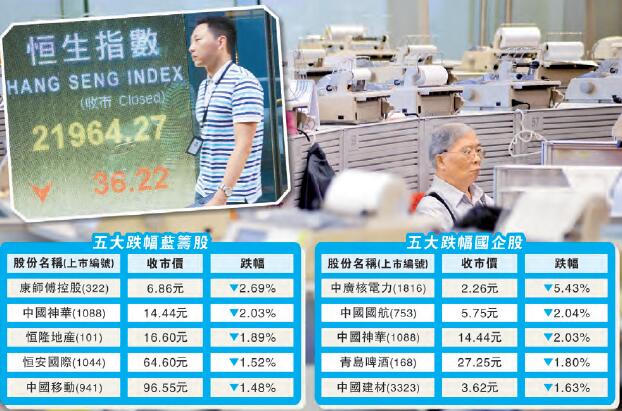 重磅股昨天升跌不一,中移動(941)收跌1.45%至96.55元;友邦(1299)亦跌0.51%至49.05元;控(005)跌0.2%至50.35元;騰訊(700)升0.33至185.2元;港交所(388)升0.47%至192.4元。地產股回吐,十大下跌榜內占三席,恒隆(101)收跌1.8%;太古(019)跌1.3%。新地(016)及新世界(017)同跌0.3%。