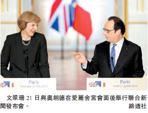 文翠珊向奧朗德表示,離開歐盟并不代表離開歐洲,英國將繼續與歐盟夥伴保持傳統友誼。而脫歐涉及方方面面,英國需要6個月時間做相關準備。奧朗德稱,他同意默克爾較早前的表態,即讓英國有時間準備脫歐談判。但為了歐盟和大家共同的利益,脫歐談判還是越快越好。奧朗德強調,正式談判之前可以做準備工作,但談判前不能提前交易。共同市場限制移民不能兼得奧朗德特別指出:「如果沒有人員的自由流動,就沒有商品的自由流動,沒有資本的自由流動,沒有服務的自由流動。英國要作出選擇:留在這個共同市場并容許自由流動,或者反之。」文翠珊則回應說:「今年6月的脫歐公投傳遞了一個非常明確的信息,即我們應該對人員的自由流動實施一些控制。」她表示自己也有意傳遞這個信息,并稱「我們也希望在商品和服務貿易方面達成良好協議,這些都是要談判的事。」