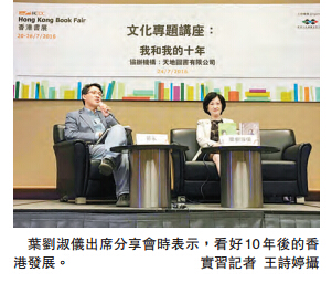 【香港商报网讯】实习记者王诗婷报道:香港经济转差,加上政治纷争愈来愈多,「港独思潮」又抬头,但新民党主席叶刘淑仪昨日出席书展活动时表示,仍然看好10年後的香港发展,因为香港拥有稳健的根基,只要加以调整,定能再蓬勃。