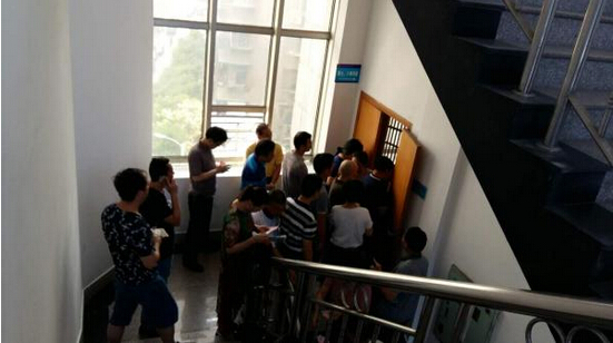 7月20日,郴州北湖區法院第八審判庭門口,旁聽人員正在等待安檢。 澎湃新聞記者 譚君 圖