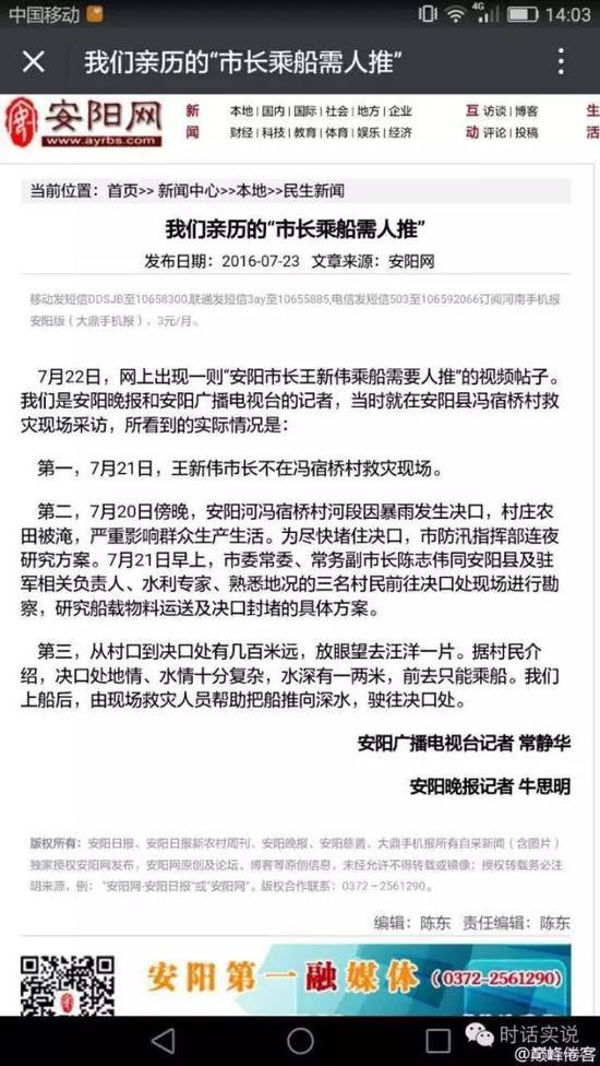 7月23日清晨5:37分,安陽新聞網上由安陽晚報和安陽廣播電視臺的記者常靜華和牛思明署名刊發看一篇《我們親歷的“市長乘船需人推》的“說明新聞”,稱當時他們就在安陽縣馮宿橋村救災現場進行采訪,他們看到的實際情況是: