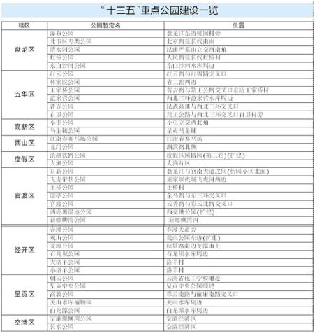 “十三五”期間,昆明擬規劃提升“十大公園”(金殿名勝區、大觀公園、昆明動物園、西華公園、黑龍潭公園、曇華寺公園、郊野公園、翠湖公園、西山風景名勝區、海埂公園)品質,體現春城風貌。