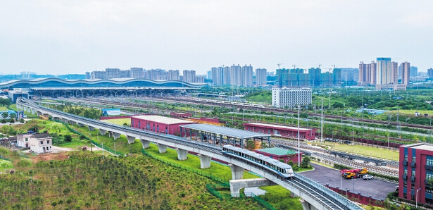 7月23日上午,中部高鐵樞紐站長沙火車南站,中國首條投入試運營的中低速磁浮線長沙磁浮快線上,磁浮列車駛出站臺。 長沙晚報記者 鄒麟 攝