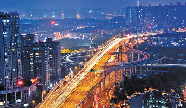 夜色中的萬家麗快速路高架橋上流光溢彩,展示著這座城市的發展速度。