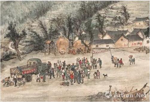 深圳關山月美術館館長陳湘波先生介紹,在建國初期建設新中國的熱潮中,許多建設工地留下了中國畫家的身影,並作為創作中國畫的主題,吻合了新中國“文藝為人民服務,首先是為工農兵服務”的文藝思想。關山月美術館藏的關山月先生描繪鄂北農田水利建設的長卷《山村躍進圖》,即在這樣的背景下創作。關山月在《山村躍進圖》中運用傳統筆墨語言,充分體現了嶺南畫派筆墨勁爽、設色鮮明的風格特點,並將平日收集的勞動形象的素材繪於長卷中,數百名勞動者形態各異、各得其所。