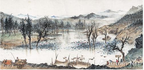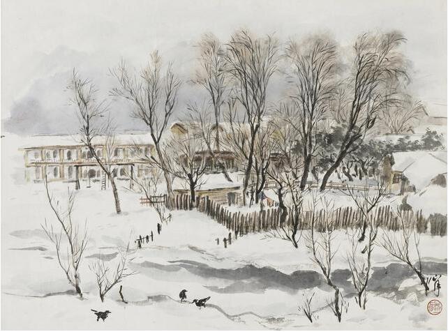 作為關山月此階段居鄂寫生精品之作,此圖秀美淨麗堪稱全畫亮點。前景大片雪景,中景的籬笆平房及散晾的衣服烘托荒寒蕭索的氣氛,遠景中南美專教學樓及宿舍樓在皚皚白雪中顯得溫暖寧靜。畫面用筆雋秀,設色淡雅,三者虛實有度,使得全畫極富空間層次感,尤其是前景中的二三孤鳥雪地覓食,更是渲染畫面一種靜謐氛圍,似乎是對中南美專美好前景的祝願和期盼。