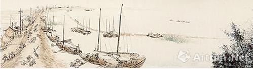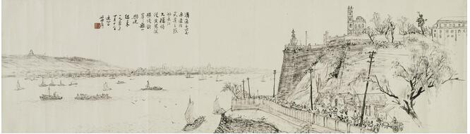 現收藏於中國美術館的《武漢防汛圖》,是黎雄才先生1956年創作的,長卷尺寸縱30.4厘米、橫2788厘米,分為三個部分,首起描繪武漢關水位不斷上漲,洪汛降至,烏雲密布;中段是抗洪搶險的種種情景;後段,洪水退卻,風平浪靜,人民回歸生產建設。以宏大的構圖展現了1954年夏秋武漢人民抗擊大洪水然的場面。時任中南美專副教授的黎雄才當時就在武漢,被軍民防汛之偉力與決心感動,他白日防洪現場一邊勞動一邊寫生,晚上進行整理和創作,終於創作成這幅“防汛詩史”。