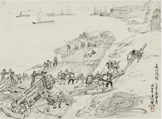 此速寫創作於武漢長江大橋、江漢橋、漢水鐵橋等尚未建成時,長江碼頭上的工人緊張有序搬運木材的工作場面,畫面構圖以對角線的形式,使觀者視覺中心在前景數組人物之間來回。遠景帆船點點,悠遠平和,烘托出前景人們在岸邊繁忙的景象,新鮮而真實、蘊含濃厚的生活氣息。