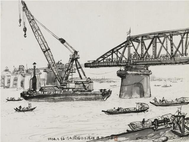 漢水鐵橋於1953年十一月底動工修建,並在百年來最高水位的洪水威脅中用戰鬥的精神堅持了工作。此畫創作於1954年九月,作為表現武漢勞動景象的代表作品之一,關山月在此畫中描繪了漢水鐵橋工人們正在起重機後方拖拉橋梁的情景。揮著旗子、喊著口號,大家竭盡全力,氣勢如虹,引得江上大小船只紛紛駐足觀望。看似風景速寫,實則栩栩如生還原了人民群眾的生產生活,再現這座工業城市的無限活力,從中體現作者由國家建設取得巨大成就而產生的強烈自豪感和創作激情。