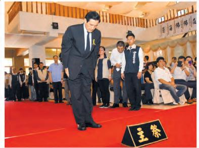 在家屬完成祭拜後,公祭儀式於下午1時舉行,馬英九首先抵達,一臉肅穆進入公祭會場弔唁:上香、獻花並行三鞠躬禮,隨後逐一與在場的罹難者家屬握手致意,停留約5分鐘後上車離去,全程並未發言。
