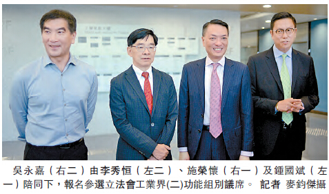 廠商會副會長吳永嘉昨日由廠商會會長李秀恒、前會長施榮懷、副會長戴澤良等人陪同下,到九龍城報名,參選立法會工業界(二)功能組別議席。吳永嘉在報名後表示,廠商會在過去一直為社會做不少事,在香港市民心目中的地位亦有提高,而在重大議題上則先會徵詢廠商會的同事及會員意見,才向政府反映。