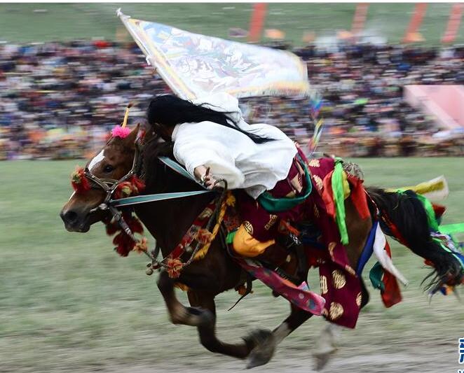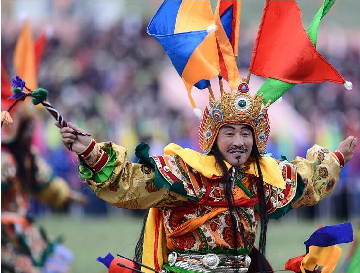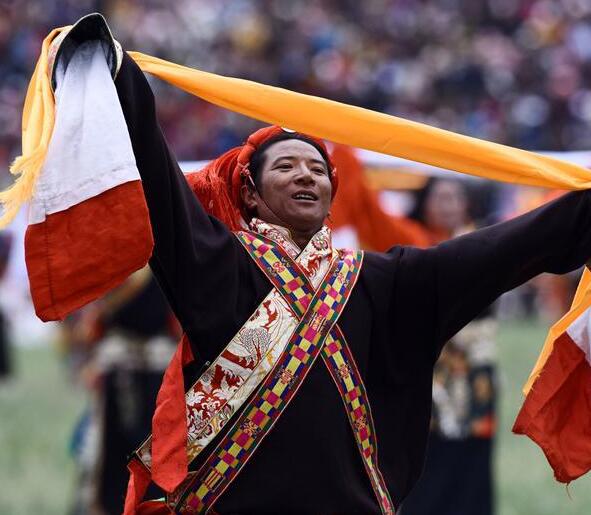 7月25日,演員在開幕式上表演舞蹈。當日,玉樹傳統賽馬節暨首屆雪域格薩爾文化藝術節在青海省玉樹藏族自治州玉樹市紮西科賽馬場開幕。本次賽馬節為期4天,包括賽馬、馬術、犛牛競技賽和文藝演出等,吸引國內外遊客前來觀賞。新華社記者 張宏祥 攝