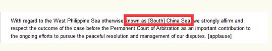 雖然以內政為主,杜特爾特還是談及南海問題,根據菲律賓媒體發布的講話原文,杜特爾特還發生了口誤,將中國南海稱為“中國海”。“針對西菲律賓海,又稱中國(南)海問題,我們堅決肯定并尊重常設仲裁法庭的判決,并將此作為和平解決、管理沖突的重要促進”。