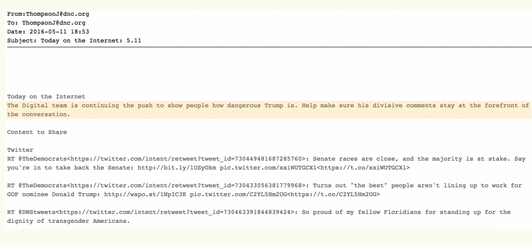 此外,不少泄露的郵件涉及對特朗普的應對措施,如有DNC高管在郵件里要求在社交網站上把黑特朗普的話題推上首頁和熱門。