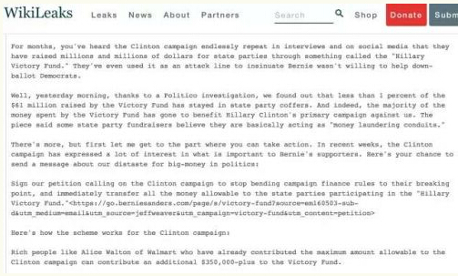 有多封郵件指出希拉里勾結DNC進行洗錢活動。之前希拉里團隊在電視和媒體上宣傳自己靠著希拉里勝利基金為民主黨籌集到了數以百萬的競選基金,然而,現實卻是募集到的6100萬美元中,只有不到1%的基金留在了黨內的金庫,剩余的絕大多數都流向了希拉里的競選團隊——用來打擊桑德斯。