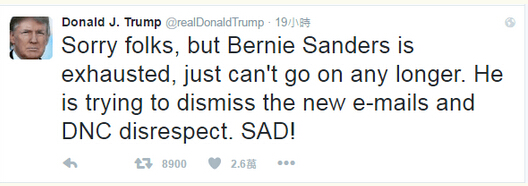特朗普說到,“這些郵件表明,民主黨競選系統明顯被操縱,伯尼·桑德斯一開始就沒什么機會。”他在自己的Twitter上稱:“伯尼·桑德斯累了,不能繼續前行了。他正努力忽視新郵件,不去理睬DNC的不敬。讓人憂傷!”