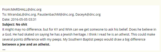 在一封郵件里,一員工提議DNC散布一篇關于桑德斯支持者的負面文章。另一封郵件中,DNC首席財務官布拉德·馬歇爾則建議,對桑德斯的宗教信仰提出質疑能暗中削弱他的候選人資格。