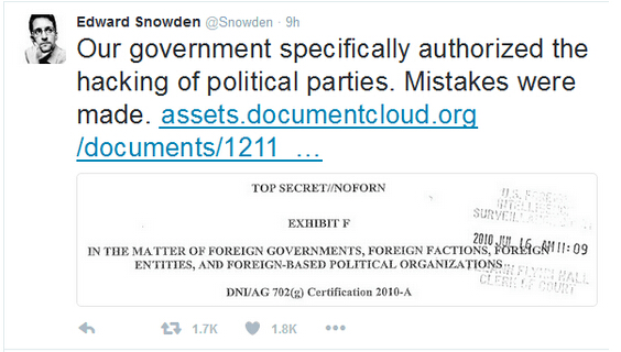 原標題:斯諾登公開絕密文件:美國曾批準對國外政黨實施網絡攻擊