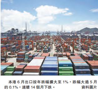 【香港商報網訊】記者莊海源報道:政府統計處公布,本港6月出口按年跌幅擴大至1%,跌幅大過5月的0.1%,連續14個月下跌;進口貨值跌0.9%。該月錄得有形貿易逆差456億元,相等於商品進口貨值的13.3%。6月商品整體出口貨值為2965億元,其中轉口貨值為2929億元,按年跌0.8%;港產品出口貨值則為36億元,跌12.9%。該月商品進口貨值為3421億元,按年跌0.9%。今年上半年的商品整體出口貨值較去年同期下跌3.9%,其中轉口貨值下跌3.7%,而港產品出口貨值則下跌16.0%。同時,商品進口貨值下跌5.6%。