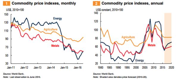 世行剛剛在美國當地時間周二發布的最新季度大宗商品市場展望中,更新了其對大宗商品的預期。世行認為,今年大宗商品的價格下跌幅度比早先的預期幅度小,且因需求上升推動,價格將在2017年溫和上漲。特別是糧食和原油價格在近些年因超額供給和全球經濟疲軟等因素價格一路南行,世行認為“最苦的日子”已經過去。