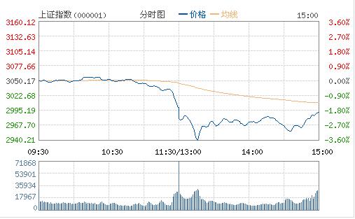 受理財監管傳聞等利空消息影響,滬指盤中重挫近4%,雖然保險、銀行板塊護盤,大盤仍失守3000點,創業板為代表的小盤股成下跌重災區,兩市近百股跌停。