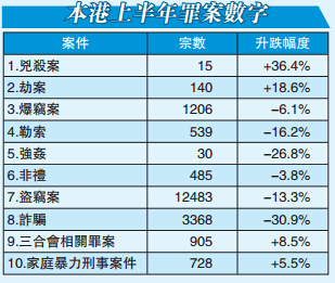 上半年上升的凶杀案中,录得15宗数字升幅,其中4宗为误杀案,包括4月份慈云山车房爆炸案及一宗发生在精神上没有行为能力的院舍内;另外15宗凶杀案中,有14宗已被侦破。同样上升了的行劫案中,较去年同期上升了22宗,升幅一成八,当中并未有涉及真枪劫案,持疑似手枪案件有3宗。