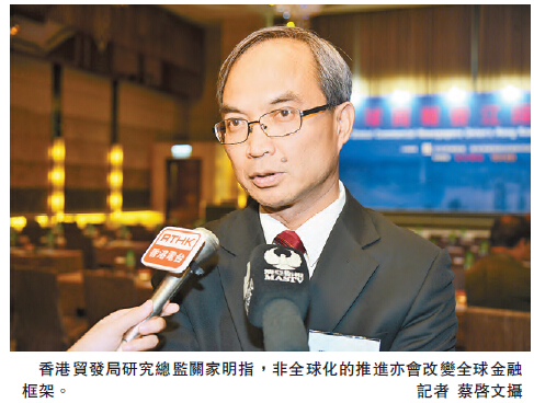 金融以往的全球化都為著配合貿易的需要,隨著英國脫歐,他相信往后歐洲國家脫歐盟會成為現象,而現時全球的經濟正是走非全球化。他續指,現時中東局勢緊張,引伸難民問題以及美國大選導致民粹主義冒起亦成為全球經濟非全球化的導火線。他分析指,非全球化的推進亦會改變全球金融框架,當中涉及的國家的角色和經濟秩序亦有所改變,雖然未必會取代金融框架內的傳統發達國家地位,但會為那些國家帶來競爭。