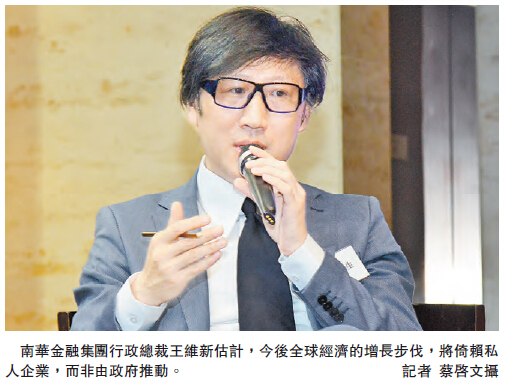 南華金融集團行政總裁王維新昨日表示,亞洲地區經濟存在諸多問題,加上歐洲經濟仍在谷底,在上述背景下,美國有望成為全球經濟的「火車頭」。他估計,今后全球經濟的增長步伐,將倚賴私人企業,而非由政府推動。(香港商報記者 鄺偉軒)