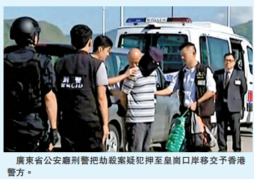 【香港商报网讯】记者万家成报道:本年3月大埔找换店割喉劫杀案中在内地落网的疑凶,昨日在皇岗口岸粤港分界之处,由省公安厅正式移交予香港警方。粤港警方都形容是次移交罪犯是双方合作下的成功案例,是合作共赢的典范。依据粤港两地警务合作机制,自2000年以来,广东公安机关已向香港警方移交香港籍通缉犯共172名。