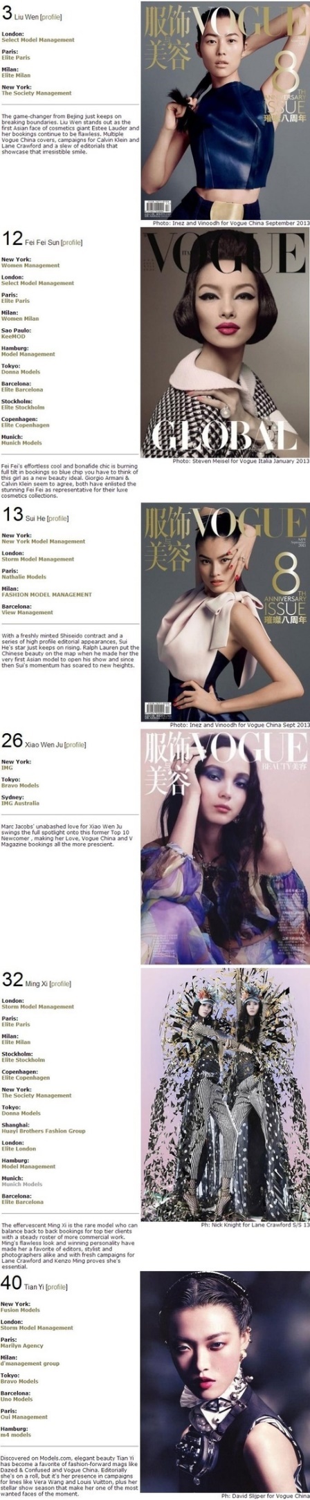 在Models.com上前50名的模特中,有6名中国女性上榜。她们或许可以代表西方对中国美女的偏好。